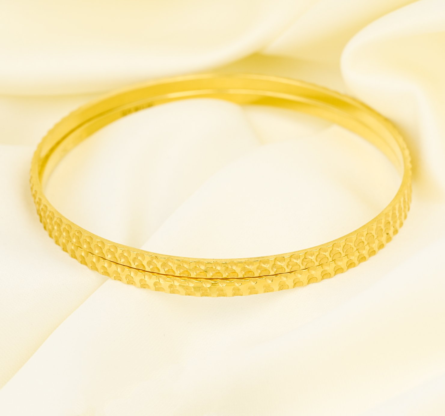 Embrace refined simplicity with our Golden Mirage Bangles from Saravanas Jewellers. These elegant 22K yellow gold bangles feature a subtle textured pattern that adds depth and shimmer, making them a perfect choice for both daily wear and special occasions.