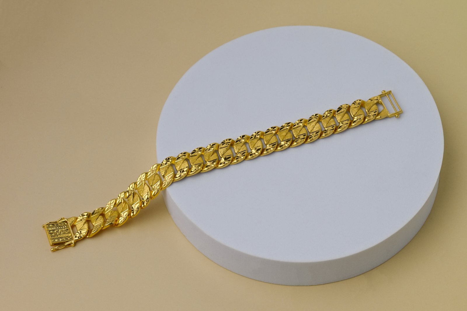 Discover elegance with the 22K Gold Diamond-Cut Wide Bracelet from Saravanas Jewellers. Crafted from pure 22K yellow gold, this bracelet features a wide band beautifully enhanced with diamond-cut detailing that reflects light from every angle, creating a stunning sparkle. Its bold yet sophisticated design makes it a perfect statement piece for any occasion, blending traditional craftsmanship with contemporary style. Ideal for those who appreciate timeless luxury and exquisite artistry.