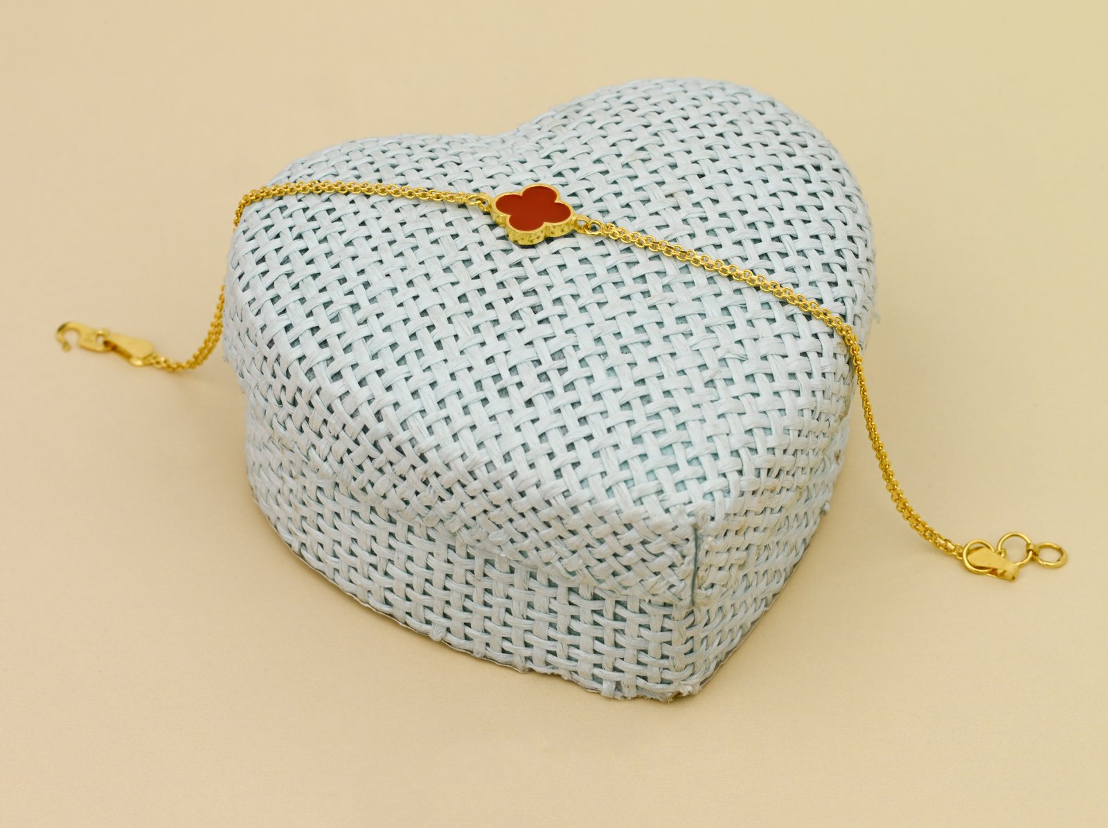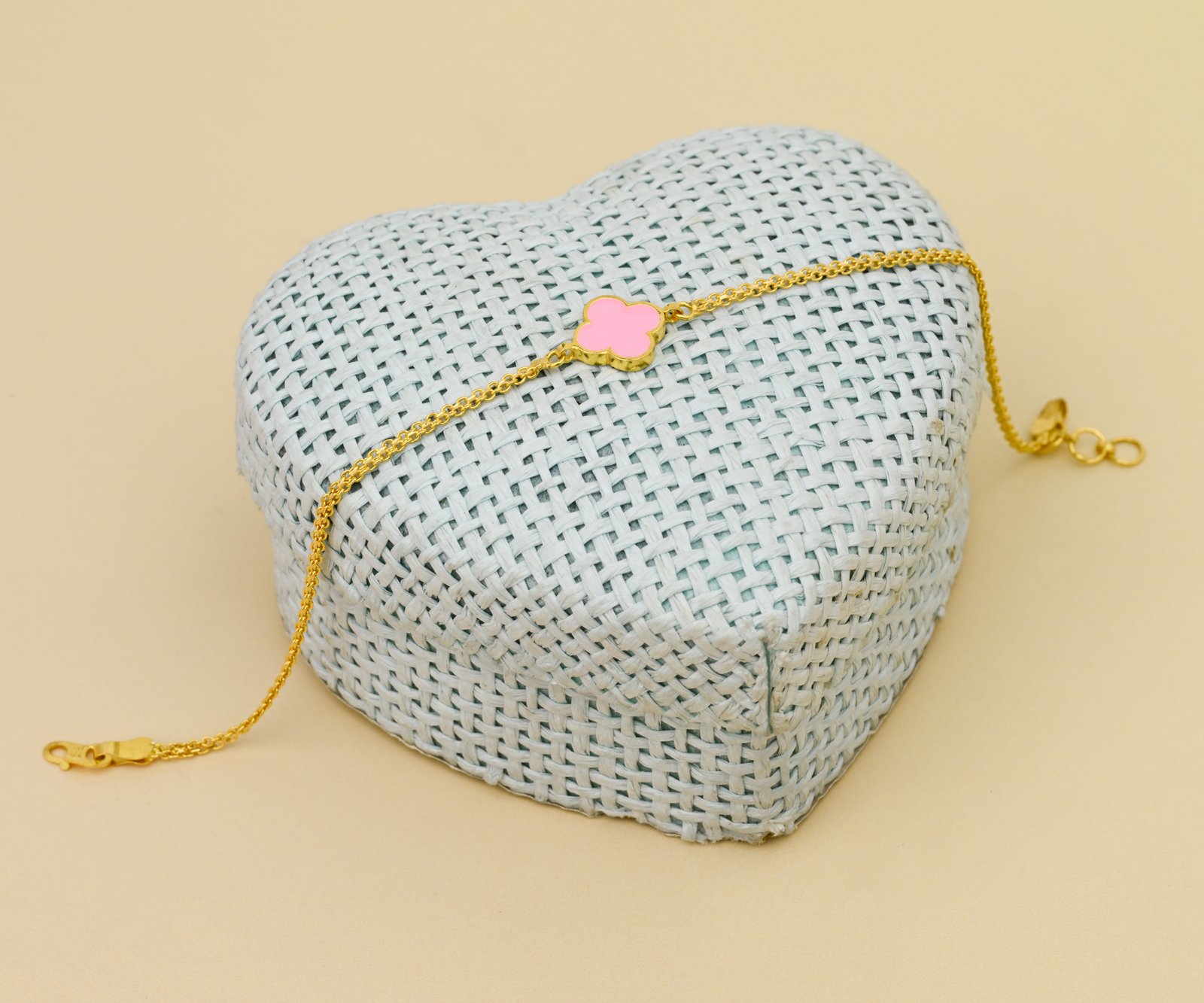 Charming and feminine, the Gold Clover & Pink Enamel Bracelet from Saravanas Jewellers is a perfect blend of modern elegance and traditional beauty. Crafted from luxurious 22K yellow gold, this delicate bracelet features stylized clover motifs enhanced with soft pink enamel accents, symbolizing luck, grace, and timeless style.